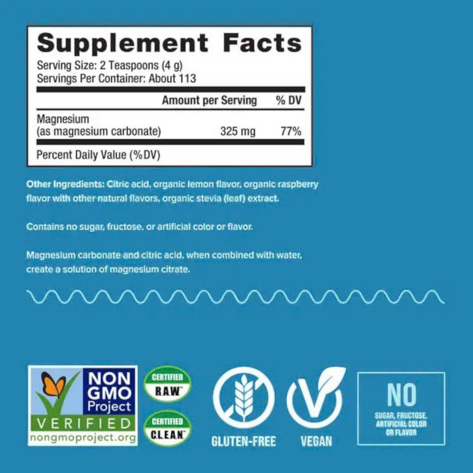 - Magnesium carbonate (325 mg/khẩu phần): Đây là thành phần chính giúp cung cấp magie cho cơ thể. Khi được pha với nước, magnesium carbonate kết hợp với axit citric để tạo thành magnesium citrate, một dạng magie dễ hấp thụ hơn.