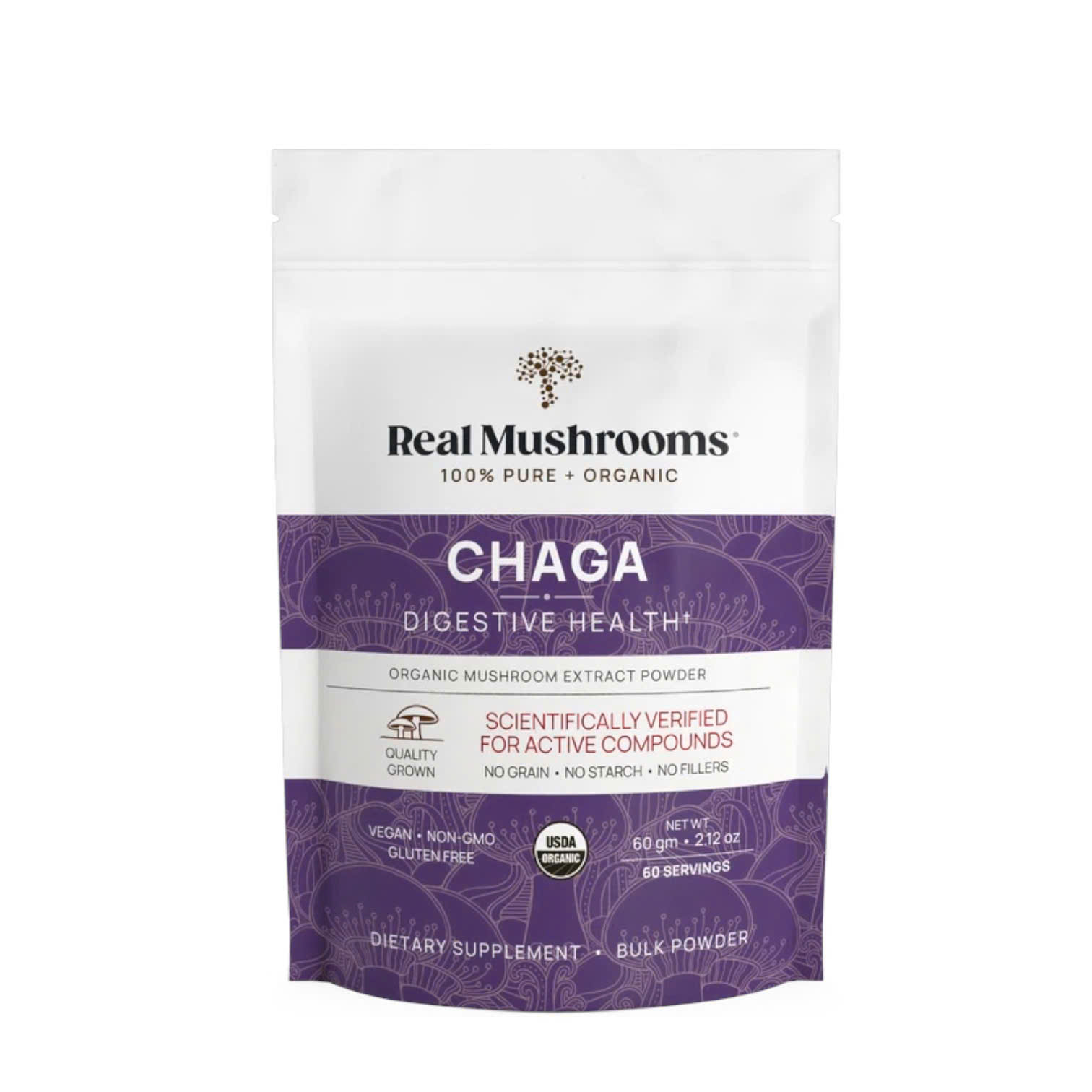 Bột Chiết Xuất Nấm Chaga Hữu Cơ Real Mushrooms 60g không chứa hóa chất bảo quản, không GMO, và không gluten, phù hợp với những ai có chế độ ăn thuần chay hoặc cần lựa chọn thực phẩm tự nhiên và sạch.