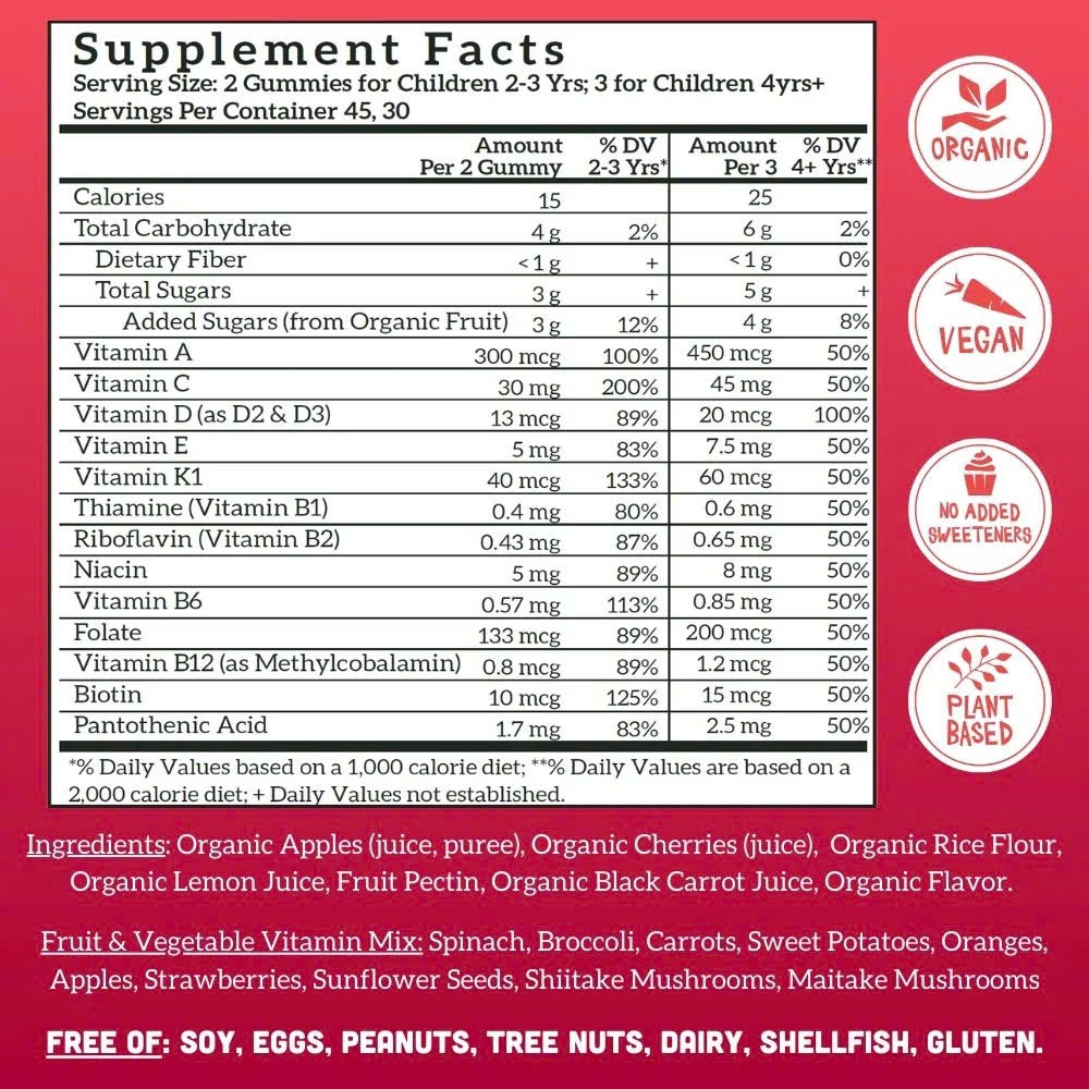 - 13 loại vitamin thiết yếu từ thực phẩm toàn phần: Mỗi viên kẹo chứa các vitamin thiết yếu như Vitamin A, C, D, E, K và nhóm vitamin B bao gồm B1, B2, B3, B5, B6, B7 (Biotin), B9 (Folate) và B12. Những vitamin này được chiết xuất từ thực phẩm toàn phần như táo, dâu tây, cà rốt, khoai lang, nấm shiitake và maitake, giúp cơ thể trẻ hấp thụ tốt hơn so với các loại vitamin tổng hợp.