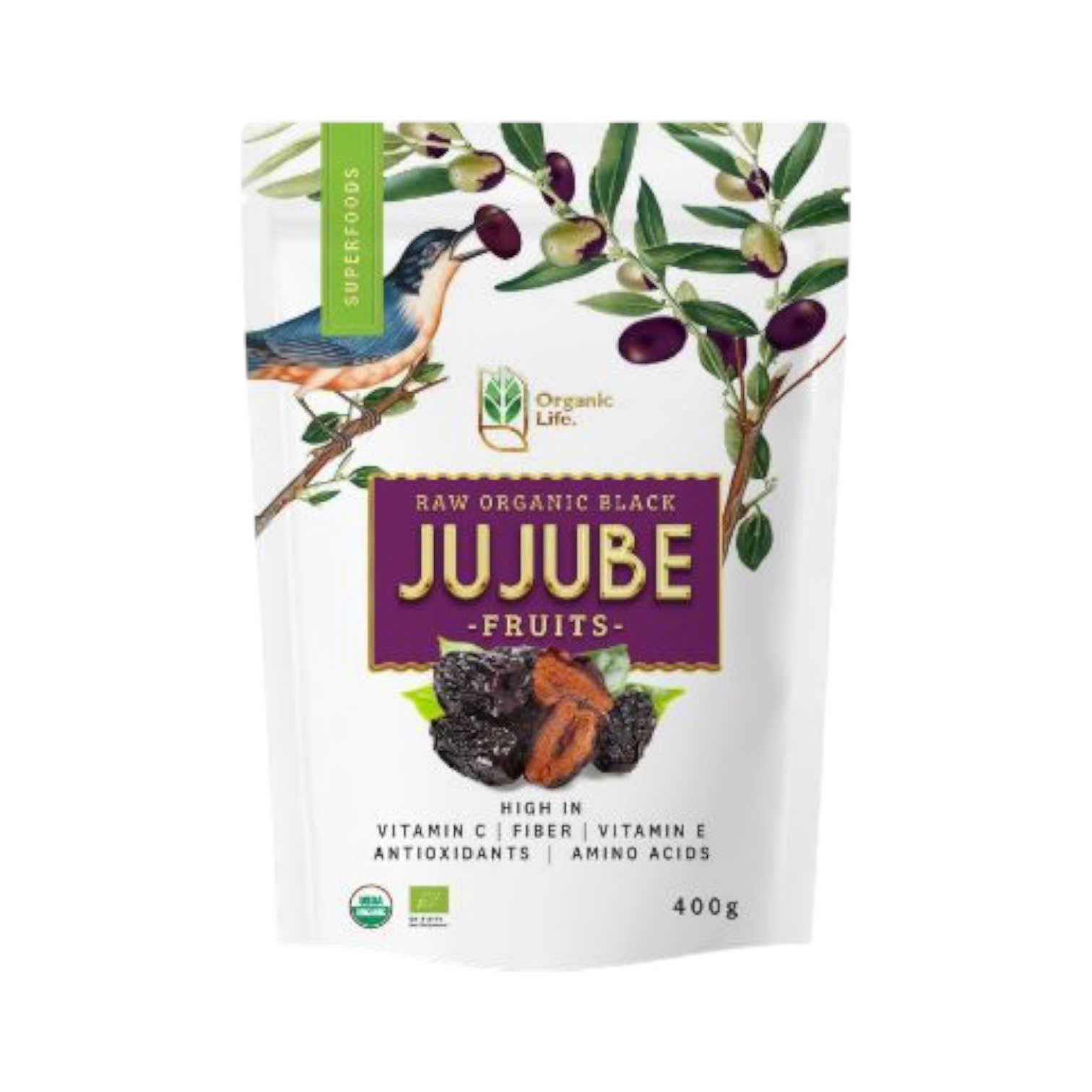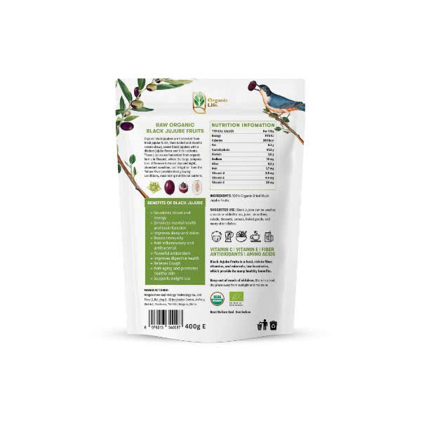 Táo Đen Hữu Cơ Organic Life 400g được chứng nhận hữu cơ bởi USDA và EU, mang đến sự an tâm tuyệt đối về chất lượng. Sản phẩm được chế biến từ táo đen sấy khô, nguồn gốc từ vùng Thiểm Tây, Trung Quốc.